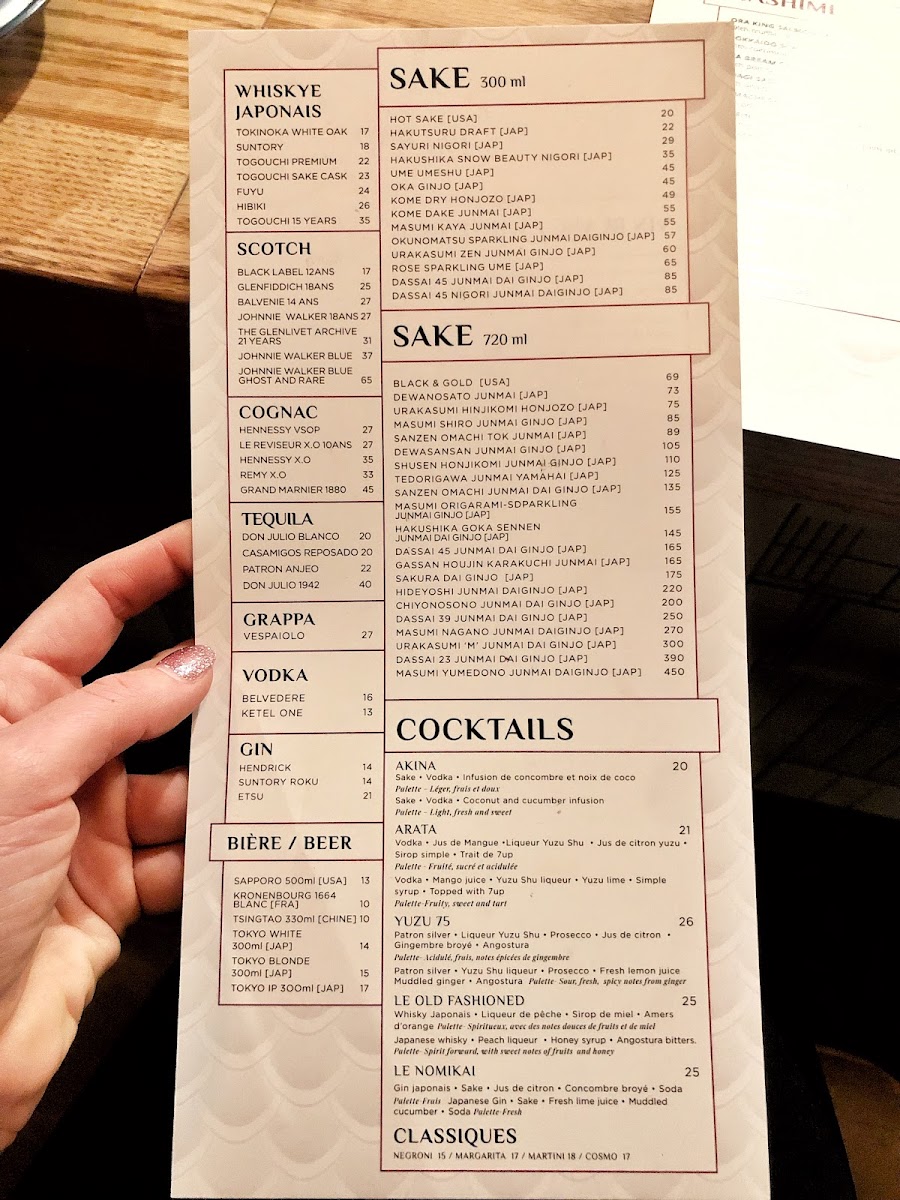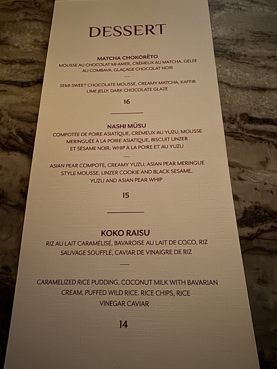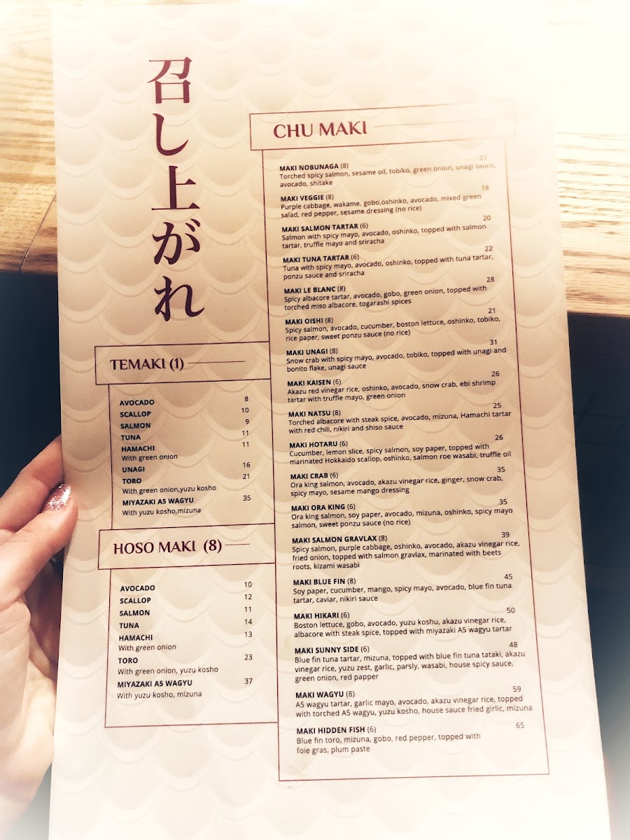8 morceaux. (papier nori) tartare d’hamachi, piment chili rouge, sauce shiso & sauce nikiri sur albacore flambe avec epices a steak, mizuna & avocat. / 8 pieces. (nori paper) hamachi tartare, red chili pepper, shiso paste & nikiri sauce on top of torched albacore with steak spice, mizuna & avocado.
